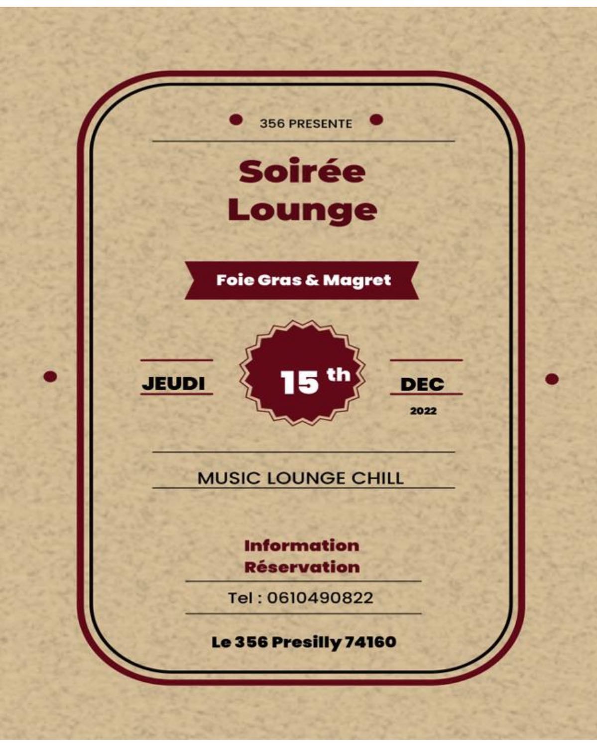 Soirée Lounge avec FOIE GRAS / MAGRET - Réservation avant le 14/12... places limitées !!!